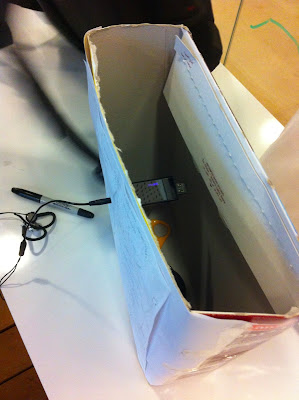 Our first prototype was made out of a cereal box (the equivalent of a napkin prototype, but with a cereal box..) so we could rapidly revise and iterate according to the feedback we get. We plugged a couple of MP3s and let users experience the feeling of connecting to another area's musical vibe: